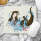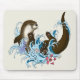 A cute brown river otter playing in the water with flowers in a cream coloured backdrop