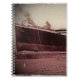 Image in soft pink cast of the Titanic leaving port. People can be seen on the deck of the ship.