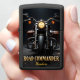 This dark, sleek, and focused design is a classic tribute to the Veteran Rider and the Road Commander of the open highway. The centerpiece is a powerful, low-angle frontal view of a classic cruiser motorcycle rendered with high-contrast chrome and black metallic finishes. The perspective emphasizes the bike's imposing front tire, powerful engine block, and the large, brightly glowing amber headlight that cuts through the dark studio background. Distinctive features include the wide handlebars and the rugged brown leather saddlebags visible behind the engine, symbolizing long-haul capability and endurance. The clean, dark background focuses all attention on the mechanical beauty and power of the machine. The bold, three-dimensional golden text "ROAD COMMANDER" is prominently displayed, celebrating the rider's mastery, veteran status, and confident authority over the road.
