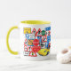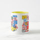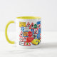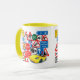 These colorful road signs from the United Kingdom, and a smart yellow car, kids should enjoy this colorful mug!