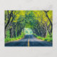 picturesque road winds through a dense tree alley where closely planted trees create a shaded tunnel-like pathway. Light filters through the branches, adding a serene and enchanting atmosphere.