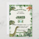 Celebrate your little one's big day with this adorable and adventurous dinosaur-themed 1st birthday invitation! Featuring a collection of friendly, hand-painted style dinosaurs like a T-Rex, Brontosaurus, and Triceratops surrounded by lush jungle foliage and vibrant greenery, this design sets the perfect prehistoric scene for your child's first milestone. The clean, neutral background allows the green and earthy tones to pop, making it a beautiful and exciting way to invite guests to your 'One-asaurus' party. Easily personalize the template with your child's name (like "James" shown here), the party date, time, and location for a custom touch.