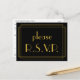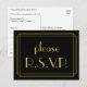 This generic 1920s inspired style R.S.V.P. postcard design features the message "please R.S.V.P." on the front. It also features a customizable RSVP form on the back, along with a customizable address that the completed RSVP cards would be mailed to. RSVP cards like this might be used to find out who will be attending a wedding shower, a dinner party, a wedding anniversary party, or some other celebration.