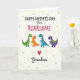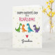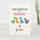 This greeting card features a creamy background sprinkled with small golden four-point stars that add a gentle sparkle ❤️. Across the upper area, the text reads “Happy Mother’s Day to a ROARSOME Grandma,” with most words in dark lettering and “ROARSOME” standing out in larger uppercase letters. A bright red heart sits between “ROARSOME” and “Grandma,” like a little visual hug that turns the phrase into something affectionate. Along the lower half, four friendly prehistoric creatures march side by side, their rounded shapes and soft smiles suggesting an easy closeness, like family leaning in for a photo. Each creature has its own color—green, orange, blue, and purple—with simple spikes along their backs and small details that make them feel distinct. The overall layout feels open and airy, with plenty of space around the message so the characters and stars can shine 🌼. The dinosaurs form a neat horizontal line near the bottom, with the stars scattered above them on the pale background.