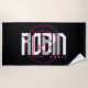 This graphic offers a contemporary reinterpretation of the Robin emblem, blending classic elements with modern design sensibilities. The logo centers around a bold, geometric depiction of the word "ROBIN," set in stark white against a deep black background, encapsulated within a striking pink circle that adds a dynamic visual contrast. The circle not only frames the text but also breaks through it, suggesting Robin's emergence from the shadow of Batman to establish his own identity. The use of pink adds an unexpected twist, lending a fresh and modern vibe while still paying homage to the traditional red associated with Robin. This design captures the essence of Robin's evolution as a character, blending his heroic legacy with a sleek, urban aesthetic suitable for a new generation of fans.