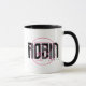 This graphic offers a contemporary reinterpretation of the Robin emblem, blending classic elements with modern design sensibilities. The logo centers around a bold, geometric depiction of the word "ROBIN," set in stark white against a deep black background, encapsulated within a striking pink circle that adds a dynamic visual contrast. The circle not only frames the text but also breaks through it, suggesting Robin's emergence from the shadow of Batman to establish his own identity. The use of pink adds an unexpected twist, lending a fresh and modern vibe while still paying homage to the traditional red associated with Robin. This design captures the essence of Robin's evolution as a character, blending his heroic legacy with a sleek, urban aesthetic suitable for a new generation of fans.