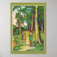 vintage painting of robbin hood the heroic outlaw in english folklore and a popular folk hero in medieval times, meeting and shaking hands with little john in the woods a lushious green forest with trees, river and bridge. robbin hood with bow and arrow in sherwood forest in nottinghamshire meets little john wearing green and red and yellow clothing. bright greens and yellows a vintage illustration of the english folk here of nottingham meets one of his merry men under the shade of a large tree in sherwood forest in shire of nottingham.