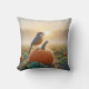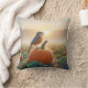 A small bird perches on a large pumpkin singing as musical notes emerge from its beak against a sunrise backdrop in a misty pumpkin field