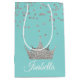Glam custom medium sized gift bag done in robin's egg blue, with graphics of a silver tone crown and diamonds, sprinkled around the top. Personalize the white text, on the front of the bag, to read what you want. Great gift bag suitable for any age Princess.
