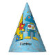 A cute blue and yellow robot on a computer circuit background. Great birthday party hat for the four year old!