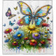 A mixed media illustration of a field of wildflowers and butterflies with a robot butterfly in charge.