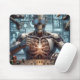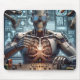 A humanoid robot is seated at a workbench surrounded by tools and intricate components. The setting is futuristic with digital screens in the background.