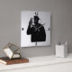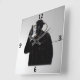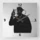 This wall clock shows an image of a robotic man with an electrical cord plugged into the back of his head. The man has lifted the front of his face off and holds it out in front of him. There are multiple colored wires running from his detached face into the empty front cavity of his head. An expressive and imaginative image created by my son, David Mann.