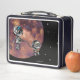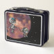 Fun metal lunch box with original artwork by Dizzydebbie, of a metallic looking robot walking a robot dog in space, with a red tone planet in the background. Great gift idea for any sci fi lover.