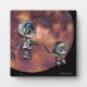 Fun stand up plaque, of a metallic looking robot walking a robot dog in space, with a red tone planet in the background. Great gift idea for any sci fi lover.