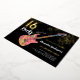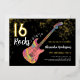 For the girl that loves to rock, cool rock guitar music themed 16th birthday party modern invitation. Rock and roll colorful electric guitar with gold glitter and musical note illustrations with personalized gold modern calligraphy typography on a black background. This easy to use template creates the perfect personalized invitation to celebrate sixteen in rockstar style. Perfect if you have a live band or are a guitarist, musician and music lover. Unique musical instrument original artwork by artist Catherine Sweetman
