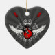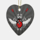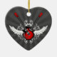 Customizable heart shaped ceramic ornament with crossed electric rock guitars, wings and vintage florals on red, white and black.