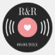 Rock and roll vinyl music record wedding favor sticker with monogram. Cute heart with monogrammed name initials of bride and groom plus date of marriage. Personalized thank you stickers, save the date label, envelope sealers or favor seals. Elegant typography for bride and groom name initials. Chic design / fancy design. Customizable background color. Romantic 60s 70 80s theme design.