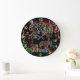 Dark and twisted chaotic rainbow musical notes background with black and gold metal ROCK and a drummer playing a trap set. Wild and crazy like a psychedelic drum solo, this clock might be a bit too much for some conservative types, but can be hypnotically compelling for certain creative souls watching the passage of time.