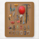 Rock climbing creates an interesting still life on this mouse mat / mousepad. Featuring a red mountaineering helmet, ice axe, and a variety of colorful carabiners and other equipment.