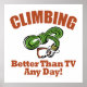 LIMBING - BETTER THAN TV ANY DAY! Rather be outdoors climbing than indoors watching TV? Then this one's for you. Rich colors and unique design - green coiled climbing rope and burnt orange carabiner. Great gift for climbers - kids or adults.