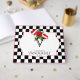 This fun wedding design is called Rockabilly Hearts and Rose Wedding. The background is a black and white checkered pattern, similar to the 1950s floor tiles. In the center of the invitation, there is a white inset with a red outline for your text. At the top there is a red rose and two hearts with banners for the bride and groom names done in a vibrant watercolor. This set has invitations, save the date cards, response cards, thank you cards, table number cards, wine labels, and many more day-of wedding stationery pieces, favors, and gifts available. All elements are printed on our high quality products, they do not include any real gold, jewels, embossing, or other textile elements. All designs are copyright Noteable Expressions, Inc. All rights reserved. Please email me at Nique@NoteableInvitations.com for matching designs, products, color matching or with custom requests.