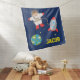 Send babies on a space adventure with this cute, colourful and attractive baby blanket. It comes with a cute astronaut boy from a rocket ship out in space, watching over Earth. Stars and planets on a dark blue sky background. Personalise easily with child's name.