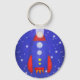 A blue and red rocket ship soars through space, in this young space lovers design!