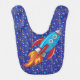 A fun bib for baby boys, features a red, gray, and blue rocket ship with flames exhaust on a background royal blue with stars and moons!