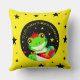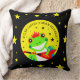 Celebrate your child's first birthdays with this colorful throw pillow, which features a cute tree frog with flaming red spiked hair and rocking a red guitar on starry black and yellow backgrounds!
