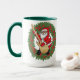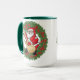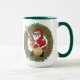 Cute Santa with electric guitar is set on a green holly wreath with candy canes.