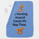 Cute, picture of two rocking horses on a blue background is featured on this baby blanket. With message, "No Horsing Around Cause It's Nap Time". This makes a great gift for a baby shower, newborn and more! Back of blanket also has a blue background and this design is available on a baby bodysuit, bib, wall decal and door sign to complete the gift set!