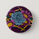 fun old school style tattoo illustration of a blue rose and pink daisys on a button.
