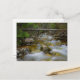 Postcard of water with motion-blur in a rocky creek in a forest in Norway with a fallen tree as a bridge over it.