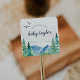 These rocky mountain baby shower bookplate stickers are perfect for an outdoor baby shower book gift. The design features a blue and green painted wilderness landscape with watercolor pine trees, birds and mountains.