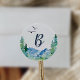 These Rocky Mountain monogram wedding envelope seals are perfect for an outdoor wedding. The design features a blue and green painted wilderness landscape with watercolor pine trees, birds and mountains. Personalize the label with the last initial of the bride and groom.