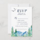 This Rocky Mountain song request RSVP card is perfect for an outdoor wedding. The design features a blue and green painted wilderness landscape with watercolor pine trees, birds and mountains. Build your wedding guest list and your dance floor song list all at once! This wedding response card conveniently asks guests if they will be able to attend your wedding, and also what song will get them to dance.