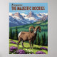 Celebrate the wild beauty of the Rocky Mountains with this postcard featuring a bighorn sheep in a vibrant alpine meadow. Snow-capped peaks and evergreen forests complete this vintage-style tribute to nature and adventure.