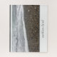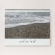 This design in natural earthy colors of grey and brown center around a seaside photo. In this image is white water from an ocean wave, which has broken and is gently rolling on the shoreline. There is custom text on this piece to personalize it.