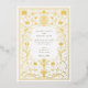 Announce your special day with unparalleled elegance using this exquisite wedding invitation, featuring a breathtaking gold foil design. Inspired by the graceful Art Nouveau era, the intricate border showcases flowing gold scrollwork, delicate stylized five-petaled gold flowers, and elegant leafy tendrils, all rendered in luxurious gold foil that creates a stunning relief effect against the pristine white or off-white textured background. The ornate floral frame gracefully arches around the central panel, where your wedding details are presented in classic typography. This timeless design is perfect for couples seeking a romantic, luxurious, and artistically detailed invitation.