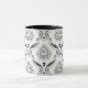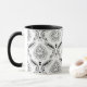 A vintage style decorative damask surface pattern influenced by rococo classical design in black line and leaf fill details on a white background.