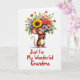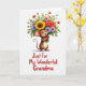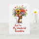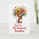 This card shows a cute, upright rodent-like character in warm brown with a cream belly and big ears lined in pink, smiling with rosy cheeks and bright eyes as it hugs an overflowing bouquet close to its chest ❤️. The little red nose and gently curled tail add a tender, friendly look, as if it’s offering the flowers to someone just out of view. At the center of the bouquet sits a large yellow sunflower, surrounded by smaller blooms in red, pink, lavender, and white, all tucked among fresh green leaves. A small red bow ties the stems, echoing the character’s cheerful blush and keeping the arrangement neatly gathered. The background is plain white, letting the warm fur tones and colorful petals stand out without distraction. Beneath the illustration, the message “Just For My Wonderful Grandma” appears in flowing red lettering, centered and easy to read 🌼. Soft, even lighting keeps the edges gentle and the colors smooth, with the bouquet angled slightly upward toward the character’s smiling face. The sunflower’s golden petals fan out widest near the top of the bouquet, with white daisies and lavender blossoms peeking around it.