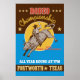 retro style illustration of a Poster showing an American Rodeo Cowboy riding a bull bucking jumping with sun in background and words "Rodeo championship all year round at Fort Worth, Texas USA