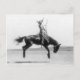 Rodeo Cowgirl vintage black and white photo from around 1920. This real life cowgirl rides proudly on her bucking horse.