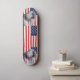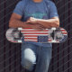Skateboard with the design of US flag and a hand of peace,power and love.