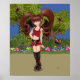 Darby the Roller Derby Fairy is a manga shoujo style faery and she is wearing a red top and skirt with hearts on her knee pads, red and black diamonds on her socks, and flames on her skates. She has black and red wings and big curly pig tails. She is skating near the woods past the beautifully colored mushrooms. Illustration by KLeighE of Hinterland Harmony Art and Illustrations.