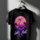 A roller-skating flamingo wearing sunglasses under a neon moon with palm trees