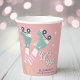Fun pastel pink roller skating birthday paper cups featuring a retro-inspired illustration of teal roller skates on a girl wearing pink-striped tube socks and "Let's Roll" in a 70's style script. Add her name dark teal blue typography.
