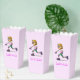 Cool pink roller skating birthday popcorn favor box for all ages with a cute and fun illustration of a girl on roller skates.