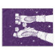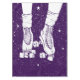 An illustration of a woman or girl roller skating at night. Their feet and roller skates are in the purple, star filled, night sky above a forest.